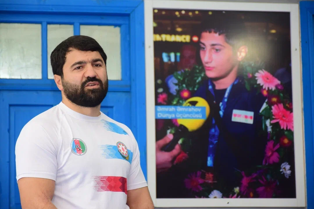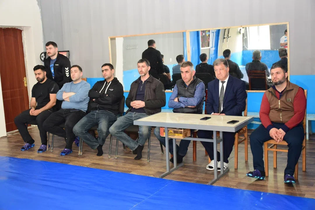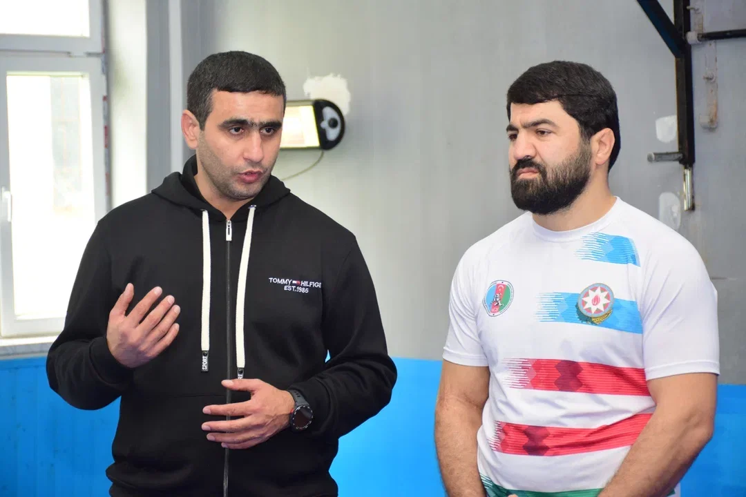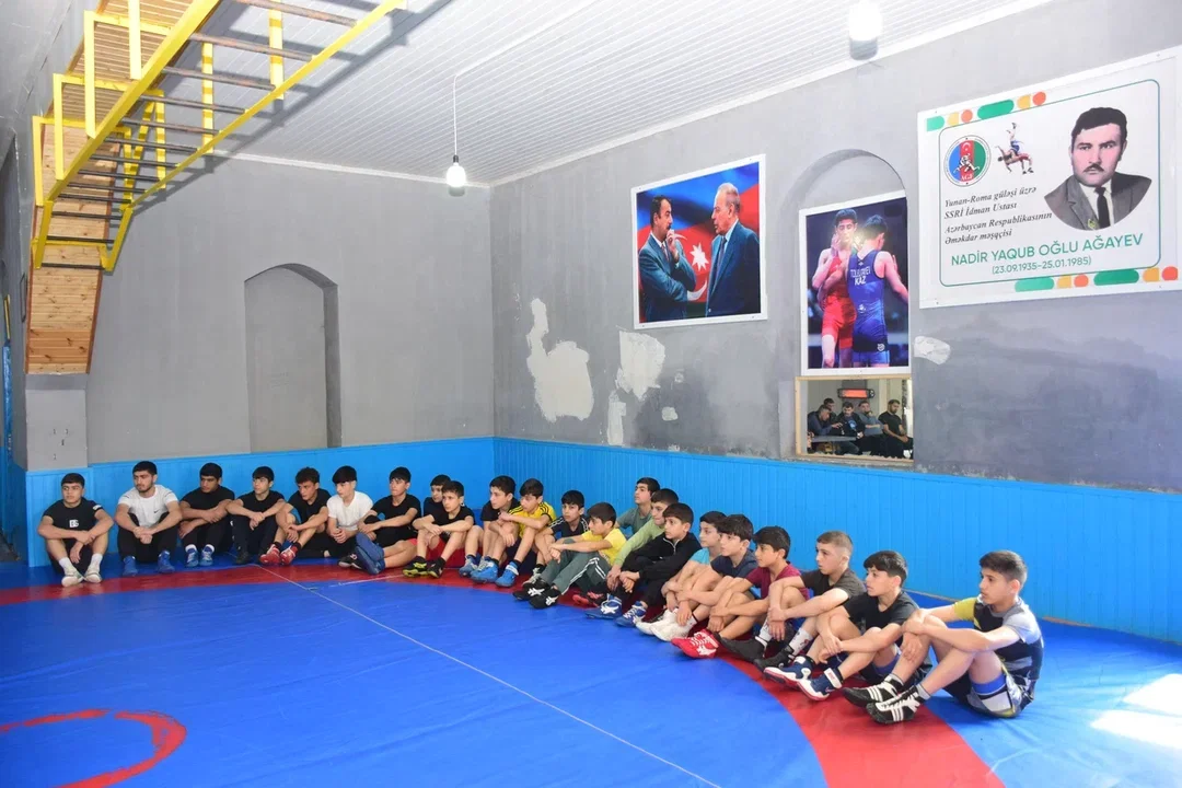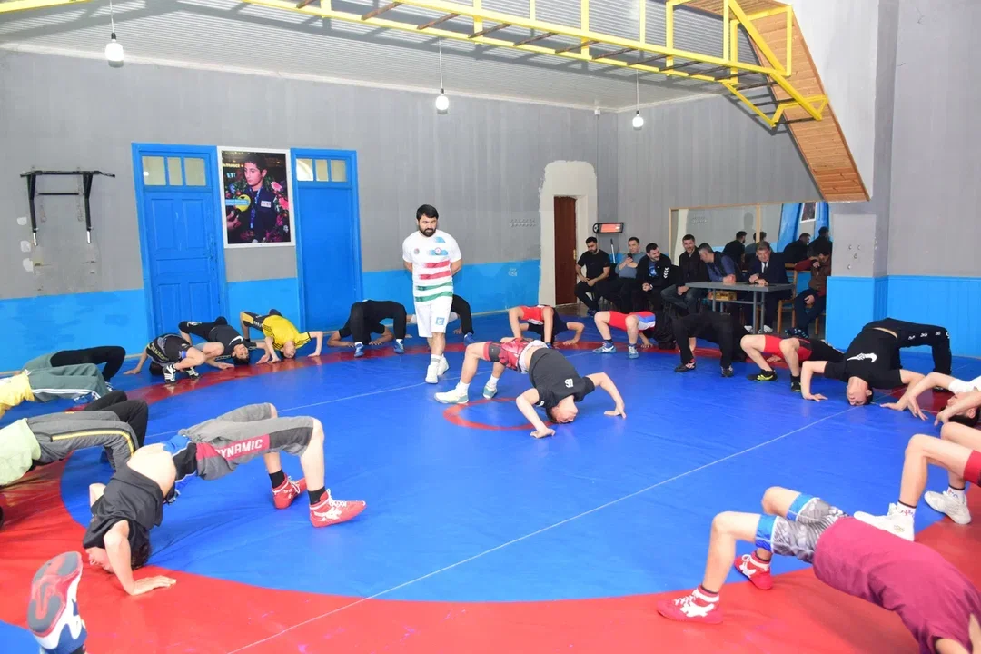Elgiz Məmmədov güləşçilərlə bir zamanlar Əməkdar məşqçi Qardaşxan Əmənovdan güləşin sirlərini öyrəndiyi doğma elində, doğma güləş zalında görüşüb.